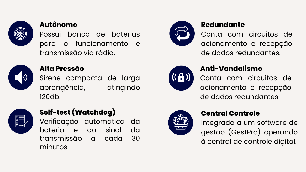 Sirene autônoma de notificações de emergência, instalado em residências, edificações e ambientes abertos.